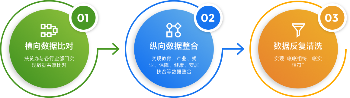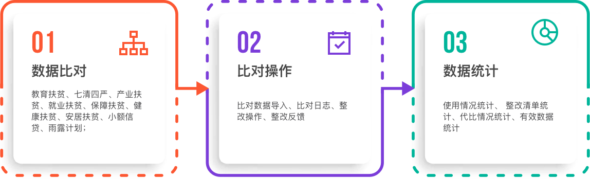 平臺(tái)圍繞“賬賬相符”加快推進(jìn)各級(jí)行業(yè)部門(mén)在全省各市縣區(qū)的數(shù)據(jù)比對(duì)工作,通過(guò)大數(shù)據(jù)分析技術(shù),運(yùn)用數(shù)據(jù)清洗比對(duì)手段,精準(zhǔn)分析出建檔立卡貧困戶精準(zhǔn)施策和各項(xiàng)政策落實(shí)的情況,并智能生成有效數(shù)據(jù)及疑似問(wèn)題清單,由各級(jí)鄉(xiāng)村振興局及行業(yè)部門(mén)針對(duì)疑似問(wèn)題清單完成整改反饋。不僅節(jié)約人工和時(shí)間成本,也簡(jiǎn)化比對(duì)流程,提供數(shù)據(jù)比對(duì)工作效率,提升數(shù)據(jù)精準(zhǔn)度,為脫貧攻堅(jiān)決策提供準(zhǔn)確的數(shù)據(jù)支持。